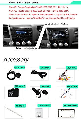 - Feature : The in-dash vehicle gps units only fit to Toyota Tundra 2007-2013, Toyota Sequoia 2008-2014, if your car has JBL sound system, then you need to buy a Can Bus decoder to decode the sound, search "Can Bus" in our store and add to cart thanks / Double Din in Dash car DVD GPS player with 8 inch 800*480 WVGA resistive touchscreen, anti-glare, day night readable; Loaded with Win CE 6.0, ARM11 processor core 800MHz CPU, DDR3 256MB RAM / Compatible with top GPS software, built-in GPS navigation; Bulit-in bluetooth for hands-free calling and phone music playing; Support AV-IN reverse camera, DVR Digital Video Recorder, Steeing Wheel Control / Support iPod/iPhone audio input; 30 stations of analog AM/FM RDS radio; Support music or video playback via SD/USB/DVD/CD/AUX-IN; Features VMCD to record 6 disc tracks into one USB drive; Suppor DTV ATSC TV Tuner; Support subwoofer and EQ; 4*50 Max Output Power / Free Mic and Free map in a 8GB map card; 12 months warranty for quality-related issues, doorstep delivered within 3-7 business days by free DHL rather than one month suggested by Amazon