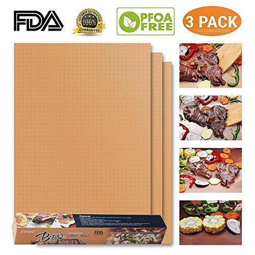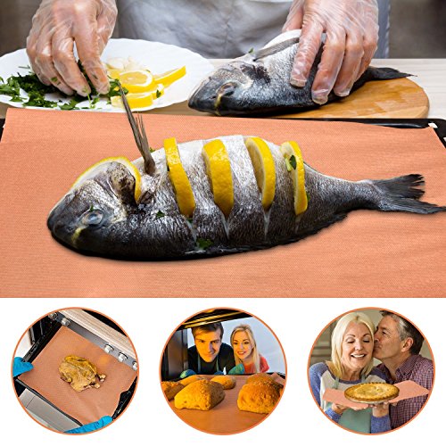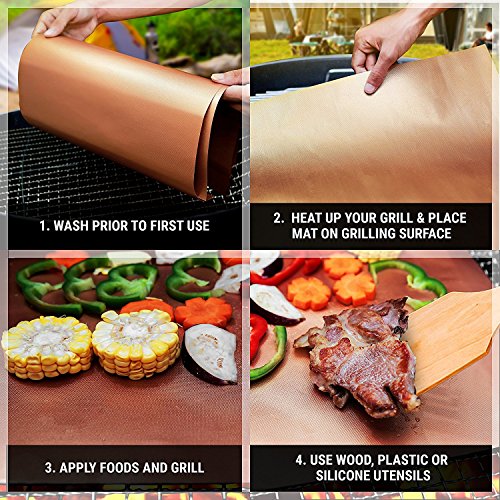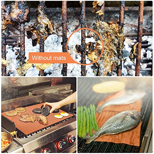 - ❖ PRIME MATERIAL FOR HEALTHIER MEALS: Set of three 15.75" x 13" copper Infused grill mats made from high heat resistant technology with fireproof material that could bear up to temperature of 500°F. Advanced quality PFOA-Free, premium PTFE (Teflon)-Fiberglass coating are used with no dangerous chemicals in order to ensure safe and healthy grilling food. It has certified as safe by the FDA approved. Extra thick for more durable and long time using. MUST HAVE KITCHEN TOOL for a home chef.