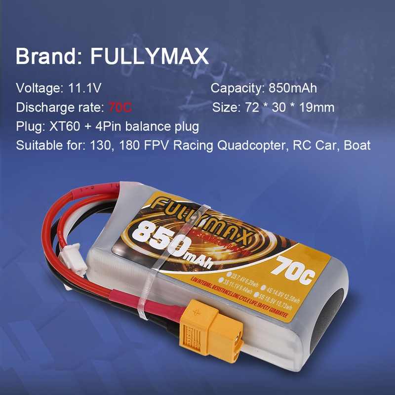 FULLYMAX 3S 11.1V 850mAh 70C li-po battery with XT60 for RC fans. This battery is suitable for 130, 180 wheelbase RC FPV racing drone and other RC car and boat with XT60 plug. Perfect choice for you to enjoy more flying fun.