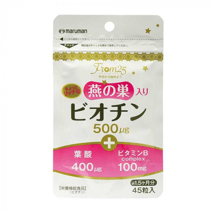 女性に必要な栄養素がギュッ!!ビオチン500μg、葉酸400μg、ビタミンB群+ツバメの巣エキスも配合。 |