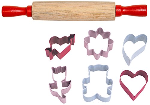 Vibrantly colorful set of cutters that inspires creativity. Cutters are made of durable, kiln-fired polyresin-coated tinplate steel. Finish is stain- and chip- resistant and dishwasher safe (top rack). The designs are detailed. Includes a kid-sized, wooden rolling pin and recipes for fun-dough and sugar cookies. Makes a great gift. Shipped in a clear-topped box.Feature