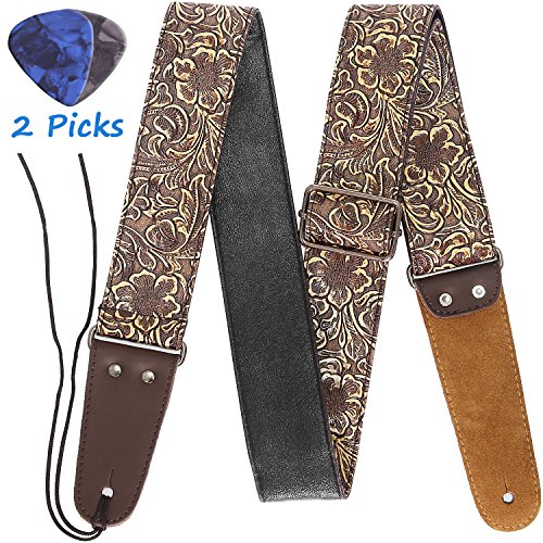 Guitar Strap, Printed Leather Guitar Strap PU Leather Western Vintage 60's Retro Guitar Strap with Genuine Leather Ends for Electric Bass Guitar,Wide Adjustment Range, with Tie,Include 2 Picks,Bronze