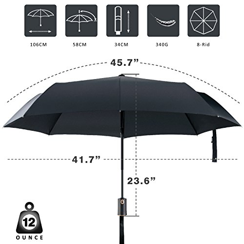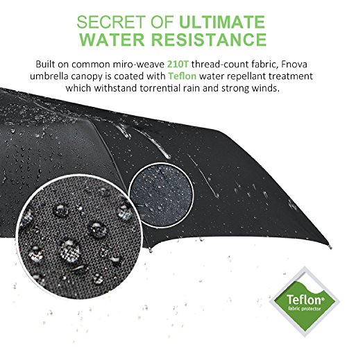 -. Binding : Misc. -. Brand : Fnova -. Color : Black -. EAN : 0701722636316 -. Feature : BEST-IN-CLASS WATERPROOF FABRIC: Unlike most travel umbrellas are made with cheap ployester or nylon that would be soaked easily in a drenching downpour, Fnova travle umbrella will keep you dry all the time with high-end canopy coated with waterproof Dupont Teflon Technology. The canopy is also crafted from 210T micro-weave Pongee fabric whereas other umbrellas use an inferior 190T polyester fabric, more durable and higher density compare to 190T. / SUPERIOR WIND RESISTANT FRAME SYSTEMS: Strong 8-ribs stand up to powerful gusts without turning inside out, Every rib is made with black metal and reinforced fiberglass which featurs Resilient Flex Memory to prevent bending or breaking. Tough enough to ensure 50 mph of wind, providing long term reliability that you can count on. / AUTO OPEN & CLOSE CANOPY IN SECONDS: Just press the button with one hand, you will avoid suffer being a wet dog when you get caught in an unexpected downpour, Auto Open/close Great for quick entry into a car, building, or tent. Easy and simple to use just with one hand. / COMPACT DESIGN FOR EFFICIENT CARRY:Our compact umbrella closed measures just 12 in long and weighs less than 14 oz for easy storage in purses, briefcases, backpacks, lage, gym bags and more.( DIMENSIONS: Closed Length: 12 in, Open Length: 23.6 in, Canopy Arc: 45.7 in, Coverage Diameter:41.7in, Weight 12 oz.) / LIFETIME GUARANTEE - Every Fnova umbrella is backed by 60-Day Money Back Guarantee + 2-Year Warranty + Lifetime Repair or Replacement Guarantee! If, For Whatever Reason, You Don't Absolutely Satisfy with Your Fnova Umbrella, Just Return It, And We'll Refund Every Penny (Or Replace It, If There Is A Problem). -. IsAutographed : 0 -. IsMemorabilia : 0 -. Label : Fnova -. Manufacturer : Fnova -. ProductGroup : Sports -. ProductTypeName : SPORTING_GOODS -. Publisher : Fnova -. Studio : Fnova -. Title : Fnova 45 inch Travel Umbrella with "Dupont Teflon" Certified, 210T Fabric -. UPC : 701722636316
