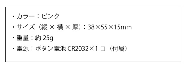 ●セット時間:最小1秒 最大23時間59分59秒タイマー機能:カウントダウン式/カウントアップ式バイブレーション:初期設定時 60秒(設定可能範囲:5-60秒)アラーム時間:初期設定時 60秒(設定可能範囲:5-60秒)アラーム音量:65dB以上時計:24時間制 6桁表示リピート機能ストラップ:1本付きお試し用電池:(CR-2032電池)1個付き