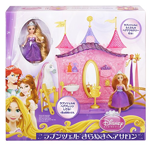 Get tangled up with the Disney Tangled Rapunzel's Castle Hair Salon Playset. With its charming castle shape, this majestic hair salon is the perfect place where all your long-haired princess characters and their royal horses can get their hair styled! The salon comes with the kingdom's best-tressed princess, Rapunzel, dressed in her signature gown. The Rapunzel doll, and her royal friends and horses, can have their hair styled with 2 pretty extensions, barrettes and a comb, or girls can wash their doll's hair in the salon washbasin, which flips over to reveal a bowl of tasty treats for the horses. For added royal flair, the salon includes a full-length mirror that, when removed, reveals an entryway for the kingdom's long-haired horses to enter. Includes salon and Rapunzel doll. Other dolls and horses sold separately. Ages 3 and up.Feature