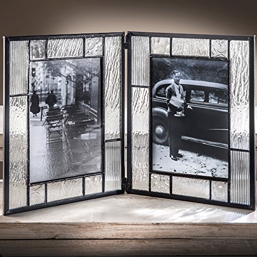 -. Feature : Tiffany styled stained glass double photo frame / This photo frame features several clear glass textures in a mission style design / Table top hinged picture frame holds two 4x6 vertical photos / Handcrafted stained glass keepsake frame made with lead free solder to protect you and the environment / Designed and Manufactured by J Devlin Glass Art 13 x 1/4 x 8 1/2