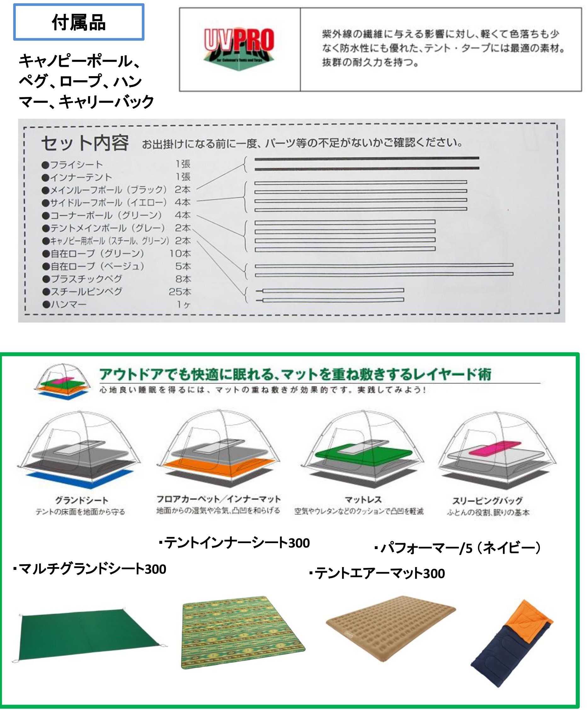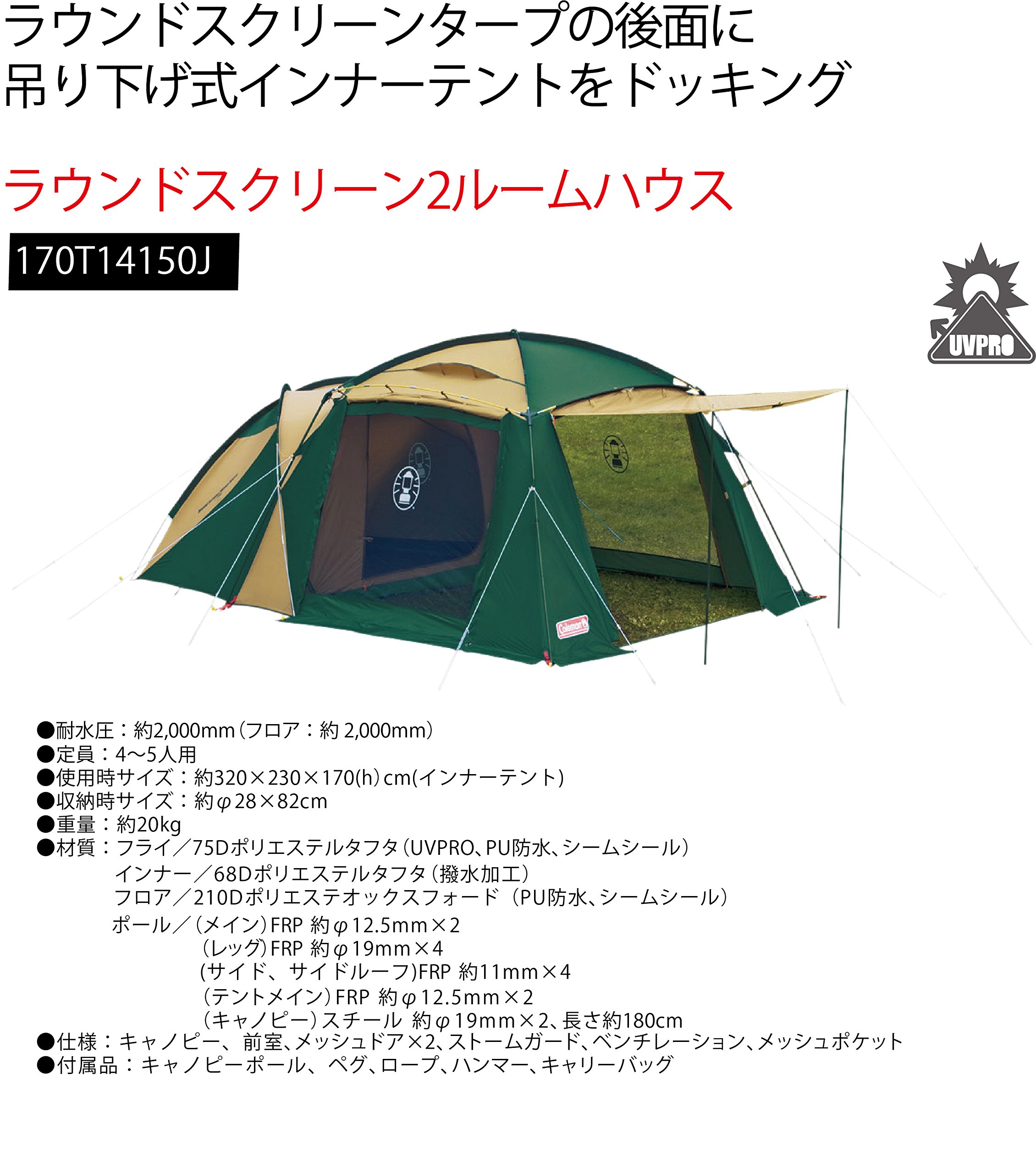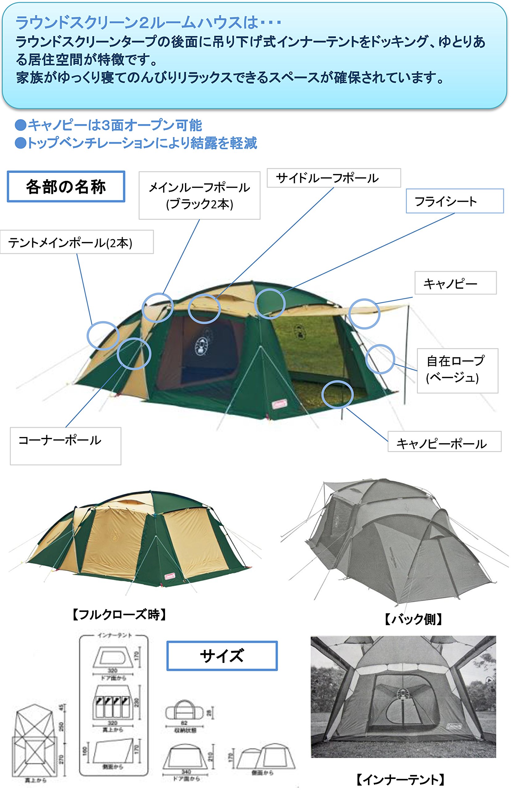 ● Docking the inner tent on the rear of the round screen ● Canopy can be opened on three sides ● Inner tent (hanging type) ● Top ventilation reduces dew condensation