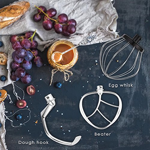 ✓Flat Beater, Dough Hook, and Wire Whip -- our mixer saves your valuable time and energy, whether you're stirring wet and dry ingredients together, kneading bread dough, or whipping cream.