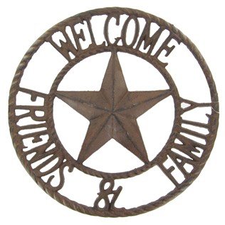 "ABC Products" - Heavy Cast Iron ~ Circular Welcome Sign - With A Star In The Center - With The Word "Welcome" At The Top - "Family And Friends" At The Bottom - Old Country Design - Wall Hanging Sign - Indoor or Outdoor Use (Bronze Rustic Finish)