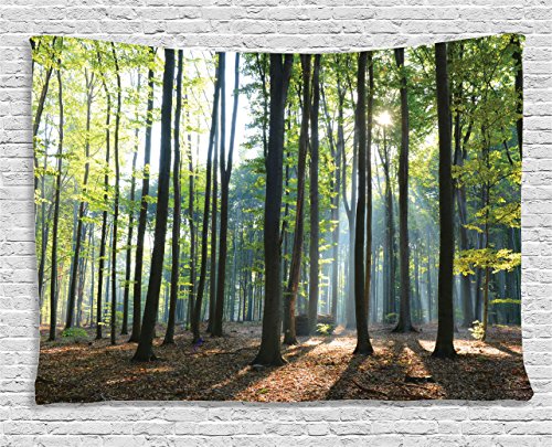 Ambesonne Farm House Decor Collection, Sunbeams Rays Shadows Morning Rising Sun Decorative Serenity Picture Print, Bedroom Living Room Dorm Wall Hanging Tapestry, 80 X 60 Inches, Green Brown