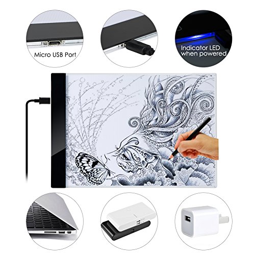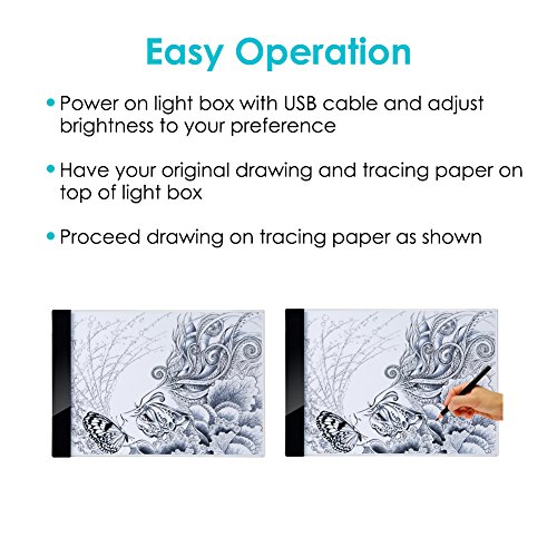 Features: 1.Track the tattoo, make tattoo works more greater. 2.Convenience for showing or to keep in a professional tattoo studio in traveling. 3.Tracing surface is made of glass and is light with energy efficient LED lighting. 4.LED light box comes with many super bright LED lamps in it which can see through very thick paper. Specifications: 1.Type: Drawing Tool. 2.Dimensions: Inch 13.18" * 9.17" 3.Lighted area size: 12.24" *9.37" 4.Thickness: 0.19 " \ 0.47cm 5.Wire Length: App 145cm 6.Material: Acrylic 7.Input: 100-240V 50/60Hz 0.35A 8.Output: 5.0V 2.0A 9.LED Art A4 Stencil Board Weight: App 630g 10.Suit for A4 Paper. Note: 1.Handle with care, do not use sharp metal objects, Protect working surface from scratches. 2.Plug in the power, it is normal for some shows a black grid. 3.Only use on a safe stable working surface. 4.After use always store in a safe dry place. Package Included: 1x A4 led light box. 1x USB Cable. 1x Power Adapter. 0 |