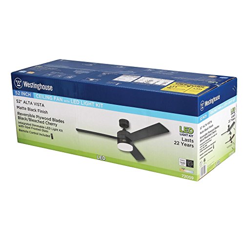 Make a dramatic statement with the Westinghouse Alta Vista ceiling Fan. Featuring a contemporary matte black finish that will coordinate with any color decor, this Fan is ideal for large rooms, from bedrooms to living rooms. This energy-efficient 52 in. Fan provides year-round comfort. The integrated, dimmable LED light kit enhances the energy and cost-saving benefits, and eliminates the need to change bulbs in hard-to-reach ceiling fans. Remote control included for convenient operation. Westinghouse is a trusted, global brand. Westinghouse knows lighting and offers products with exceptional quality, reliability and functionality. Product reference number 72059.Feature