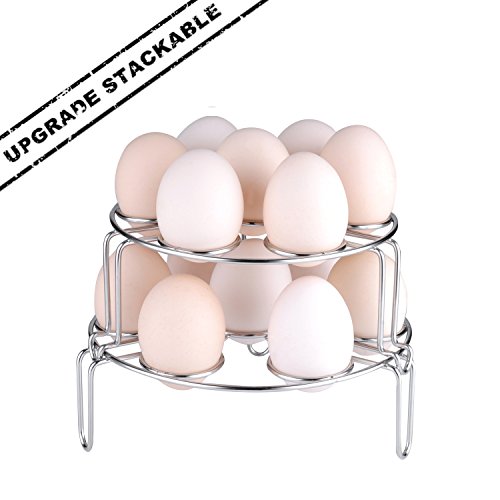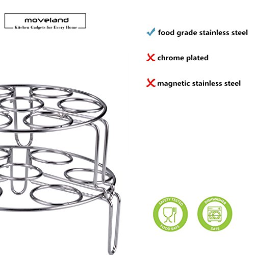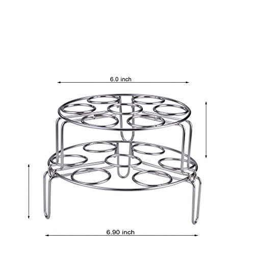 Specifications Material: 304 stainless steel The shorter steamer rack size: Height 1.8 inch ,Diameter 2.9 inch The Higher steam rack size: Height 3.9 inch ,Diameter 2.9 inch Package Includes: 2 x Different size egg steamer rack