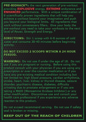 Studio : Biohacking Supplements Publisher : Biohacking Supplements Binding : Health and Beauty Product Description WHAT IS PREBIOHACK? PREBIOHACK is a powerful pre-workout specifically formulated to deliver sustained energy, strength, endurance and pumps for the entire duration of your workout or competitive event. WHAT DOES PREBIOHACK DO? - Keeps You Going: The premium ingredients in PREBIOHACK provide a steady and reliable performance boost that goes the distance with you.? - Produces Results, Not Dependency: PREBIOHACK's micronized delivery system increases your overall work capacity and pumps, improves mental focus and drive, and reduces soreness - all without creating dependency.? WHAT SETS PREBIOHACK APART? Most pre-workout supplements on the market today are glorified stimulants that overload your central nervous system and give you a temporary "rush." As your body adapts, you find yourself upping the dose - at the expense of your health - or switching to another product, which is no better. These supplements create a dependency and actually impede your progress in achieving lasting results. The first of its kind, PREBIOHACK is the only pre-workout specifically formulated with to provide you with a CLEAN ENERGY. Clean energy meaning you will feel energized without the shakiness. Recommended for both men and women, PREBIOHACK is poised to become the #1 best-selling pre-workout, and will get you up and running from the first scoop.?? ⇒ So stop wasting time and money on short-lived stimulants and get sustained, effective energy with PREBIOHACK today! 0