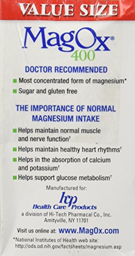 -. Binding : Health and Beauty -. Brand : Healthcare -. EAN : 0760569494121 -. Feature : Dietary Supplement / Most Concentrated Form of Magnesium* / Just one dose delivers over 120% of the Daily Value! / Dietary Intake - Up to 75% of Americans don't get enough magnesium in their diets** / Helps maintain normal muscle and nerve function** -. IsAdultProduct : 0 -. Label : HEALTH CARE PRODUCTS -. LegalDisclaimer : IN NO EVENT, REGARDLESS OF CAUSE, SHALL ALL STAR SALES BE LIABLE FOR ANY INDIRECT, SPECIAL, INCIDENTAL, PUNITIVE OR CONSEQUENTIAL DAMAGES OF ANY KIND, WHETHER ARISING UNDER BREACH OF CONTRACT, TORT (INCLUDING NEGLIGENCE), STRICT LIABILITY OR OTHERWISE, AND WHETHER BASED ON THIS AGREEMENT OR OTHERWISE, EVEN IF ADVISED OF THE POSSIBILITY OF SUCH DAMAGES. ALL STARS SALES HOLDS NO LIABILITY FOR ANY DAMAGES OR PROBLEMS FROM USE OF ANY PRODUCTS SOLD, AS WE ARE A THIRD PARTY SELLER. ALL PRODUCTS MUST BE USED AS DIRECTED AND AT YOUR OWN RISK OF RESPONSIBILITY. -. Manufacturer : HEALTH CARE PRODUCTS -. Model : HEALTH212092 -. MPN : HEALTH212092 -. NumberOfItems : 1 -. PackageQuantity : 1 -. PartNumber : HEALTH212092 -. ProductGroup : Health and Beauty -. ProductTypeName : HEALTH_PERSONAL_CARE -. Publisher : HEALTH CARE PRODUCTS -. Size : 120 -. Studio : HEALTH CARE PRODUCTS -. Title : Mag-Ox 400 Magnesium, Tablets 120 ea -. UPC : 760569494121