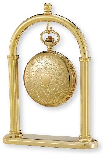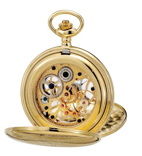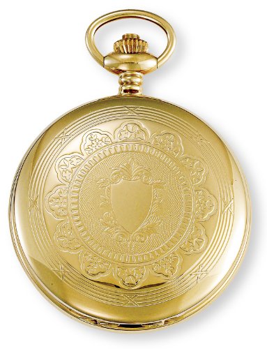-. Feature : Classic round gold-tone 17 jewel mechanical covered pocket watch suitable for engraving / Intricately designed front and back covers that both open to expose movement / Scratch resistant front and back mineral crystals / Includes 14" steel curb pocket watch chain plus bonus solid brass desktop stand / Arrives in beautiful presentation box with Selvyt polishing cloth, lifetime limited warranty and operating instructions