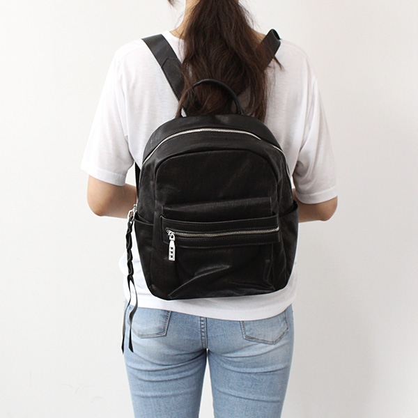 |  심플한 디자인으로 데일리백에 알맞은 멀티 주머니 블랙 백팩 소개해드려요 :) 블랙 1컬러로 준비되어 있으며 부드럽고 가벼운 인조가죽 소재로 제작되어 착용감이 편안해요. 가방 앞과 뒤, 양옆, 내부까지 주머니가 많아 자주 사용하는 소지품을 따로 보관할 수 있어 실용적이에요. 오픈클로징하는 지퍼장식 끝에는 꼬임 디테일의 끈이 달려있어 심플함에 세련미를 더해주는 포인트가 되어준답니다!