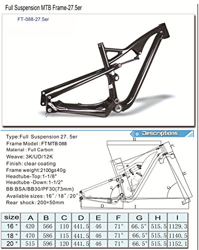 Product DescriptionType:Full Suspension 27.5er Model:FTM-088 Material:Full Carbon Weave:UD Finish:Clear Coating Frame Weight:1880 /-40g Size:16"18"/20" Headtube-Top: 1-1/8" Headtube-Down: 1-1/2" Rear Shock : 200X50mm0