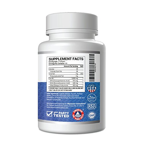 -. Feature : POWERFUL FISH OIL CAPSULES from wild fish caught using sustainable methods in deep, cold and P.R.Istine waters. NEVER Farmed! / OMEGA 3 FISH OIL with a Potent 2000mg per serving of Omega 3. One serving exceeds the 600mg daily DHA dosage recommended for maximum benefit. / FISH OIL BURPLESS benefits in a Mega-Dose 180 Capsule bottle. 915mg EPA, 630mg DHA and a whopping 455mg of Omega 3 proP.R.Ietary blend! / EPA DHA in a Pure Burpless form - Molecular Distillation reduces all heavy metals, PCB and other toxins while eliminating the disgusting fishy odor that plagues lower quality products. A hint of natural lemon and rosemary enhance the flavor while acting as natural preservatives. / 3RD PARTY PURITY TESTED - Physician Formulated Omega 3 Fish Oil Capsules are 3rd party tested and IFOS 5-Star certified to be not only pure but environmentally sustainable. A win for you and a win for the environment!