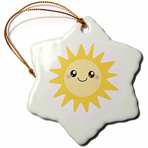 3dRose orn_113062_1 Cute Happy Sun Kawaii Yellow Sunny Happy Face Summer Sunshine Smiley on White Snowflake Porcelain Ornament, 3-Inch