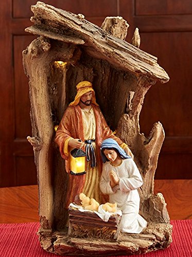 Driftwood Creche Holy Family LED Light-up 14 x 8.5 Resin Stone Nativity Table Top Figurine