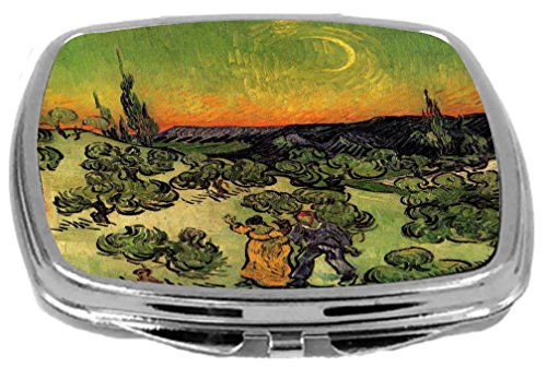 Rikki Knight Compact Mirror, Van Gogh Art Landscape with Couple Walking Crescent Moon