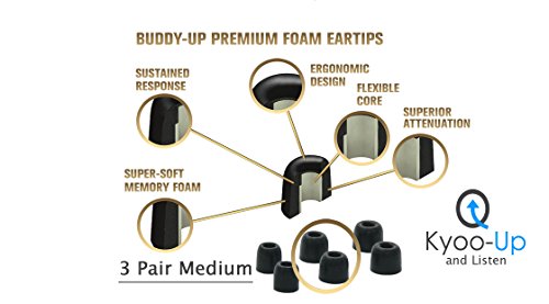 -. Binding : Electronics -. Brand : Kyoo-Up -. Color : black -. Department : unisex-adult -. EAN : 0642070670617 -. Feature : UNIVERSAL FIT / CONTOURS to the shape of your ear canal / ENHANCE Your Audio Listening experience not matter what brand headphones you use. / ADDED Stability in the Ear- Grabs and maintains it's hold while in the ear / SUPERIOR Sound isolation for your headphones -. Label : Kyoo-Up -. Manufacturer : Kyoo-Up -. Model : BU-MED-3PK -. MPN : BU3MEDBK -. PartNumber : BU3MEDBK -. ProductGroup : Speakers -. ProductTypeName : HEADPHONES -. Publisher : Kyoo-Up -. Size : small -. Studio : Kyoo-Up -. Title : Buddy-Up Memory Foam Earbud Tips 3 pair Medium (Black) -. UPC : 642070670617