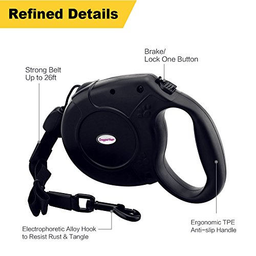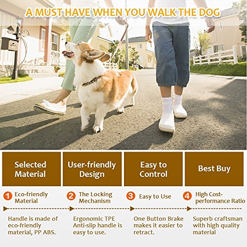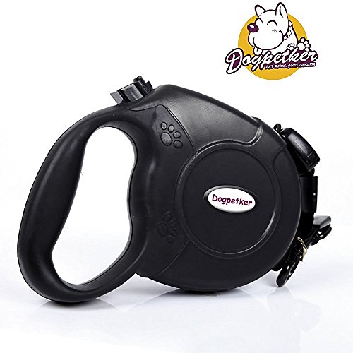 Want to HAVE FUN and have your canine UNDER CONTROL?it's never been easiler with this sturdy,straight-forward,high-powered dog leash. Reliable control - the brake system With the Dogpetker brake system, you are always in control of your dog. When the brake button is pushed, the leash instantly stops and is securely held at exactly that length. Easy to use with one hand. Freedom on the leash Enjoy the comfort of a Dogpetker retractable leash that is designed for walking your dog in open areas where they can enjoy lots of extra 'freedom on the leash'. Dogpetker cord leashes smoothly unroll and retract, no matter how you hold it. The tape leash is very resistant and ideal for powerful, larger dogs. The Dogpetker tape guidance offers high comfort and ease of use, ensuring that the tape will follow your dog in every direction, while smoothly rolling-out and retracting. When not in use, the tape fully retracts up to the chromed hook. Warning *Never try to open the plastic casing, disassemble any other parts, the spring inside may cause unexpected injuries. *Consider in advance how your dog might react in unpredictable situations. For safety reasons keeps your dog at your side before any possible dangerous situation emerges. Info: Color: Blue Weight: 12.5 ounces Shell material: ABS plastic Rope material: Nylon Adjustable length: The rope extends up to 26ft Size: Large, supports up to 110 pounds-heavy duty 0