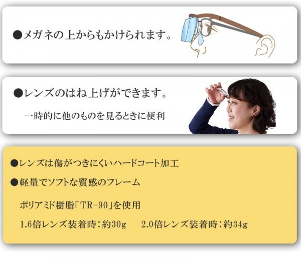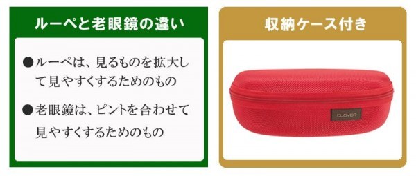 | セット内容 | フレーム(ローズピンク)、1.6倍レンズ、2.0倍レンズ、収納ケース |