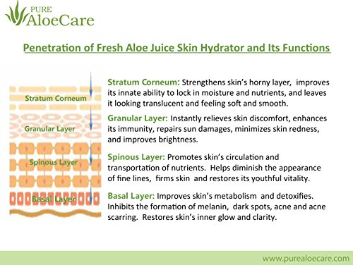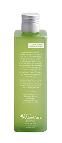 With a proprietary aloe vera processing technology from the U.S.A., PURE AloeCare Fresh Organic Aloe Juice Skin Hydrator captures the active nutrients of fresh aloe vera to nourish and hydrate your skin. Fresh Aloe Juice Skin Hydrator delivers the benefits of aloe vera: moisturizing, brightening, soothing, tightening, and rejuvenating the skin. The Fresh Aloe Juice Skin Hydrator also helps repair sun damage and reduces acne. Infusing skin with natural botanical nutrients, Fresh Aloe Juice Skin Hydrator is a perfect first step in your skin care routine.