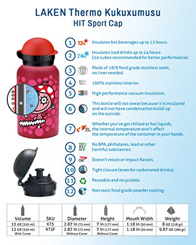 Studio : Laken Publisher : Laken Product Description Laken's narrow necked Thermo Bottle with the Kukuxumusu designs at their best with delightful, happy themes in bright colors. These bottles hold 12oz (350ml) and keep your iced drinks cold for up to 24 hours (not to be used with hot beverages). These bottles come with the Laken easy twist sport cap that opens and closes the drinking spout with a quick twist.