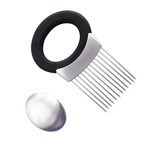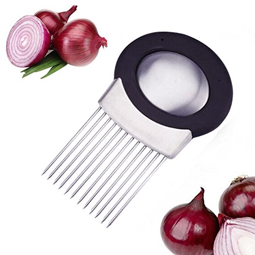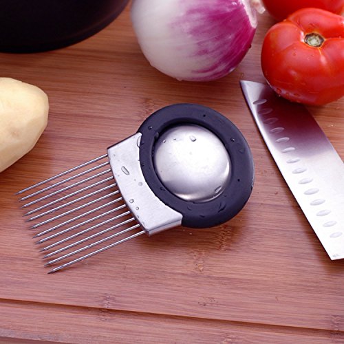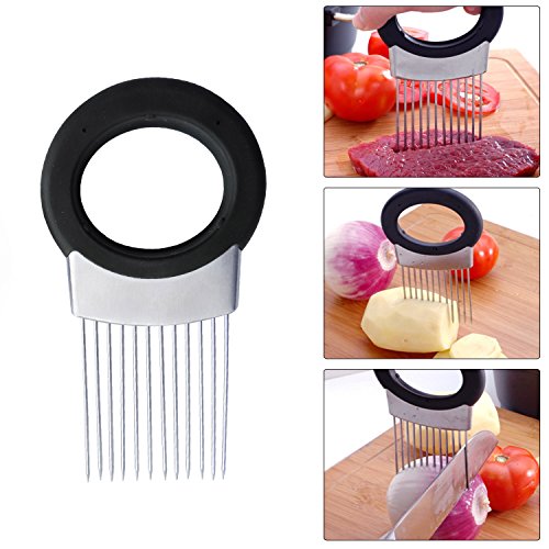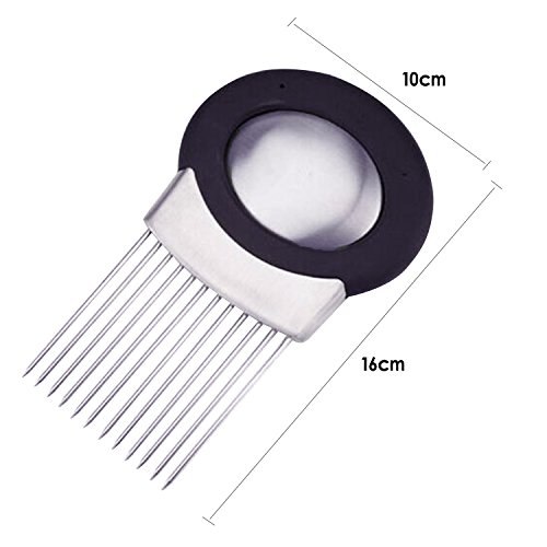 FEATURES: This onion holder onion cutter features unique stainless steel prongs that allow you to hold and slice onion hands-free. Onion slicer guide has large comfortable oval handle designed to prevent cuts & scrapes.