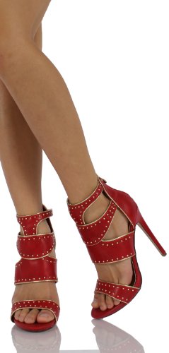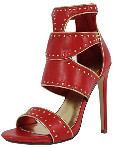 Binding : Apparel Product Description Spice up your wardrobe with these celebrity inspired studded design open toe high heels! Rock these with a trendy solid sundress to jazz up your spring look! You will want to add these to your collection! Features include faux leather upper, elastic stretch at mid -straps, studded design, scoop vamp with open toe, metallic trim, and rear zipper for easy on/off. Lightly padded cushion and non-skid rubber soles. Platform and heels measure approx 3/4" and 5" heels. 0