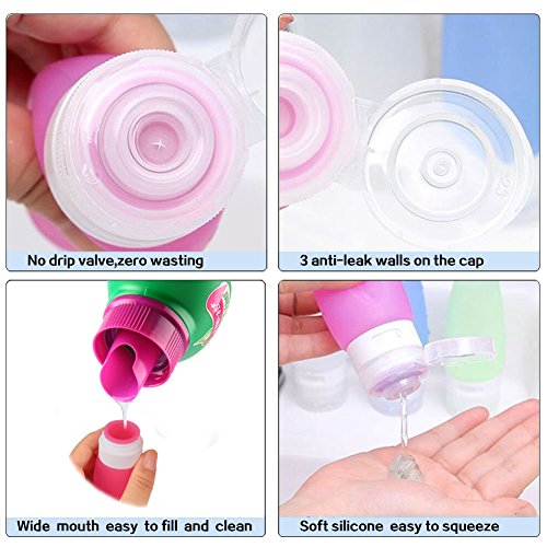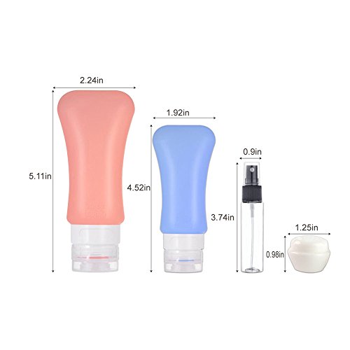- STAY-UP DESIGN WIHT NO LEAK LIDS:These travel accessories come with triple-rim sealed bottles that could help you snap securely shut to minimize the possibility of leakages so there is no need to worry about the leakages or wasting when you are on a trip outside.These 2*3 oz and 2*2 oz soft silicone travel containers come in different color,they are also easy to be identified and convenient to use.