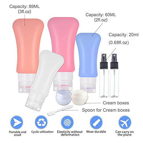 - WHAT ESSENTIALS DO YOU USUALLY KEEP in your carry-on when you are traveling?This travel accessories may help you a lot,there are 4 refillable silicone squeeze bottles,2 sprayer bottles,one spoon and 2 cream jars,perfect for your business trip or a short traveling.