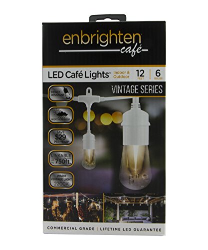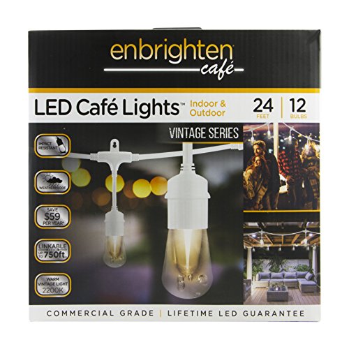 Enbrighten Vintage Series Café LED String Lights (24ft.), 12 Lifetime Bulbs, White, Premium, Weatherproof, Indoor/Outdoor, Shatterproof, Commercial Grade, UL Listed, 35646