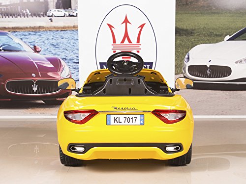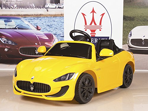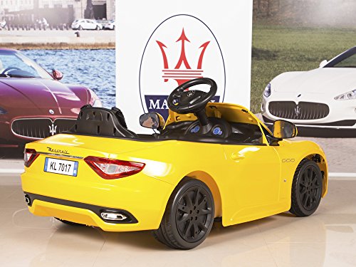 -. Binding : Toy -. Brand : BIG TOYS DIRECT -. Color : Yellow -. EAN : 0683258602518 -. Feature : Officially licensed Maserati GranCabrio electric ride on car / Can be controlled by child via steering wheel and pedal or by parent with the included remote controller / Push-button start-up with engine sounds plus SD/USB connectivity for playing their favorite tunes / Perfect For 2-4 Years Of Age with a weight capacity of 55 lbs / Functioning front and rear lights, horn, seat belt and GranCabrio floor mat -. IsAdultProduct : 0 -. Label : BIG TOYS DIRECT -. Manufacturer : BIG TOYS DIRECT -. MPN : KL7017YEL -. PackageQuantity : 1 -. PartNumber : KL7017YEL -. ProductGroup : Toy -. ProductTypeName : TOYS_AND_GAMES -. Publisher : BIG TOYS DIRECT -. Studio : BIG TOYS DIRECT -. Title : 12V Electric Kids Ride On Car Maserati GranCabrio with RC Remote Painted Yellow -. UPC : 683258602518