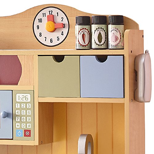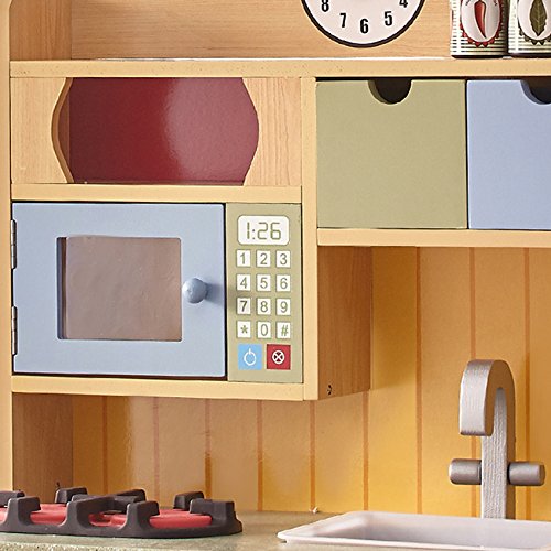 Cook up the creation of your lifetime with Teamson Kids Wooden Play Kitchen. Kitchen is super cute with knobs that turn to provide the illusion of really operating a stove! Stove opens up with a bright yellow handle for amble space to cook a feast the whole family will love. Two burners above the stove are a great place to whip up some satisfying soups or your evening tea! Make sure not to get the sink filled with dishes that you make from taking contents out of the fridge below. There is also a microwave with stick on numbers and timer to provide the illusion that an item is really being heated up. Keep track of play time with the clock above the kitchen set and be sure to store some Knick nacks or flower plants above in the wooden space that is meant for extra storage or decorating.Feature