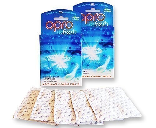 -. Feature : Specially formulated to help remove stains and kill the bacteria that build up in your mouthguard leaving it with a fresh minty taste. / Opro refresh can be used on any mouthguard or removable orthodontic brace after every use. / Mint flavour for maximum freshness. / Each box contains 20 single use cleaning tablets. / This listing is for two boxes.
