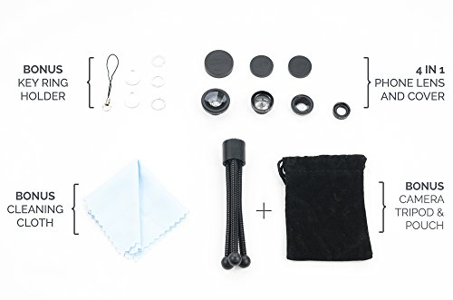 - Feature : BEST VALUE PACK WITH THREE FREE BONUS GIFTS PXElite Premium Camera Tripod For Your Camera (VALUE $4.95) Free Premium Soft Microfiber Cleaning Cloth For Your Lenses (VALUE $2.95) Key Ring And Pouch For The Lens For A More Enjoyable Experience (TOTAL VALUE $7.90) / PXELITE NEWEST PREMIUM PHONE PHOTO LENS 4 IN 1 Professional Fish eye 180 Degree Experience + Wide Angle Lens 0.67x Factor + Tele Zoom In 2X + Premium Macro Lenses with Very Secure Magnetic Adapter Attachment Works Very Well In Low Light.. / COMPATIBLE WITH A LARGE VARIETY OF SMARTPHONES Like The iPhone 5 5s 5c 6 6s 6 Plus Samsung Galaxy S3 S4 S5 S6 Note 4 Lg G3 And All The Popular New Phones Works Even With Case On Like The Popular OtterBox. / PORTABLE AND EASY TO USE Very Light, Only A Few Grams And Very Portable, You Can Hook It To Your Keys And Forget You Even Have It On. Great For Portrait, Selfies, Low Light Conditions. Comes with Silicone Protectors And Soft Microfiber Case. / PROTECT YOUR INVESTMENT If You Don't Like It, You'll Receive A Full Refund With Our 90-Days 100% MONEY BACK GUARANTEE! Or If Something Ever Happens With Your Lenses WE WILL CHANGE IT Immediately Without Any Costs From Your Side.
