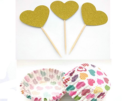 Hemarty 24 Glitter Gold Heart-shaped CupCake Toppers and 48 Cupcake Wrappers Wedding Bridal Shower Birthday Decoration Cake Topper