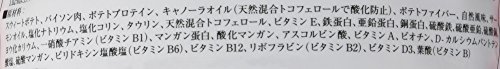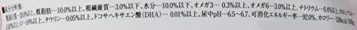 素材構成:粗蛋白質…20%以上、粗脂肪…10%以上、粗繊維質…3%以下、水分…10%以下、カルシウム…1.02%以上、リン…0.8%以上、ナトリウム…0.4%以上、タウリン…0.05%以上、マグネシウム…0.12%以下、オメガ3…0.3%以上、オメガ6…3.0%以上、尿中pH…6.5~6.7