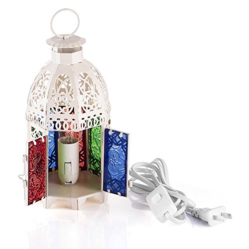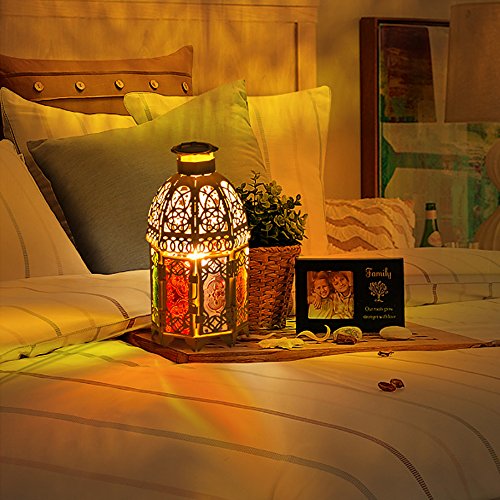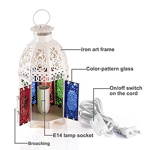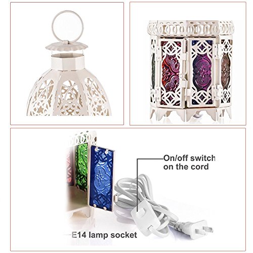 AOTOSOLO Iron Moroccan Style Matte Electric Lantern Bedside Table Lamp, Handmade Intricate Cast Cutouts Electric Square Lantern Night Lamp, with Multicolor Textured Glass