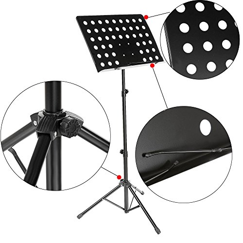 -. Feature : Material: Metal (high-quality and durable) / Height & Angle adjustable: Flexible height adjustment from 19.1 inches to 46.4 inches for your height needs. Tilting bookplate can freely adjust Angle and allow you to have the most comfortable position and angle / Sturdy legs: Tripod support legs with non-slip rubber caps for extra sturdiness and it can freely fold up/ retract, stable and tough. / Lightweight & portable: The Music Conductor Stand is folding and lightweight with carrying bag, easy to carry and storage. / The professional orchestra sheet music stand suitable for school, orchestras, choirs, church band and other special space.