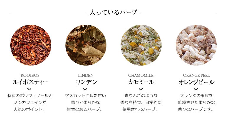 | 産地 | ルイボスティー:南アフリカ共和国 リンデン:コソボ カモミール:ラトビア オレンジピール:ガーナ ※時期やロットよって変更する場合がございます。 | 味の特徴 |