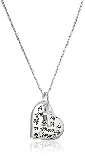Sterling silver necklace featuring mini-cross and heart-shape pendant with engraved message