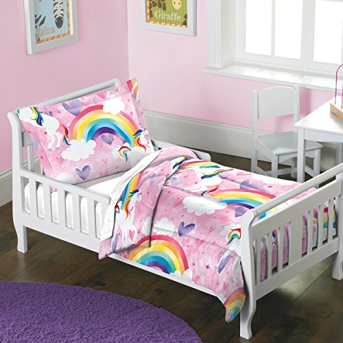 Your little princess will love this magical rainbow Unicorn comforter set! the face of the comforter and sham spotlights a whimsical design of colorful rainbow Unicorns, hearts and clouds on a Pink ground. Made of soft, 144-thread count cotton, this easy-care comforter set is machine washable. 100Percent cotton. 144 thread count. Polyester fill. Machine washable. Imported. Twin comforter set includes: one comforter (68 in. W x 86 in. L) and one standard sham (20 in. W x 26 in. L).Feature