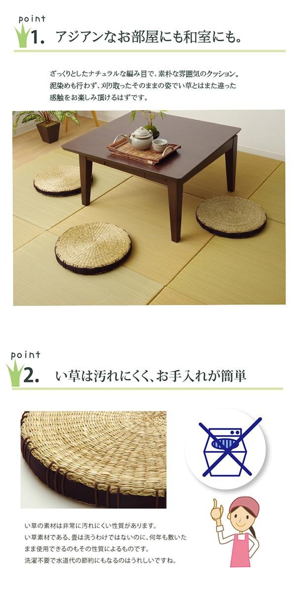 | 素材・材質 | 表地:七島い草 中材:ウレタンフォーム30mm マチ部:ポリエステル100% |