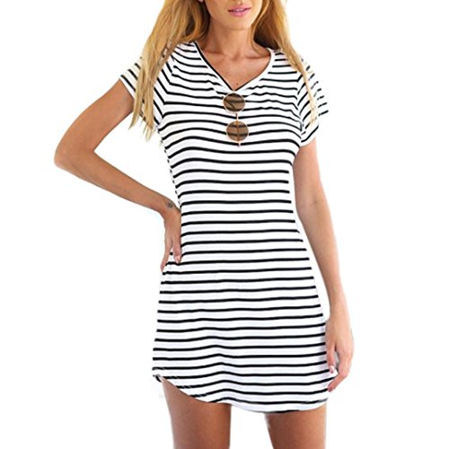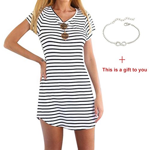 NOTE: Please compare the detail sizes with yours before you buy!!! Use similar clothing to compare with the size. Size Details: Size: S: Bust----85cm/33.5", Waist----65cm/25.5", Hip----91cm/36.0". M: Bust----90cm/35.5", Waist----70cm/27.5", Hip----97cm/38.0". L: Bust----97cm/38.0", Waist----76cm/30.0", Hip----103cm/40.5". XL: Bust----104cm/41.0", Waist----84cm/33.0", Hip----110cm/43.5". XXL: Bust----108cm/42.52", Shoulder----42cm/16.54", Sleeve----20cm/7.88", Waist----92cm/36.22", Length----89cm XXXL: Bust----110cm/43.31", Shoulder----43cm/16.93", Sleeve----21cm/8.27", Waist----94cm/37.01", Length----90cm Specifications: Gender:Women Waistline:Natural Fabric Type:Cotton Dresses Length:Above Knee,Mini Silhouette:A-Line Neckline:O-Neck Sleeve Length:Short Decoration:None Sleeve Style:Regular Pattern Type:Striped Style:Sexy Material:Cotton Blend Package include:1PC Dress OTHER NOTES: Any questions or problems to our products or service, please email us freely, we will reply and solve it for you ASAP. 0
