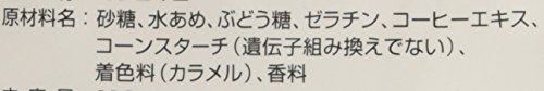 原材料:砂糖、水あめ、ぶどう糖、ゼラチン、コーヒーエキス、コーンスターチ(遺伝子組み換えでない)、着色料(カラメル)、香料